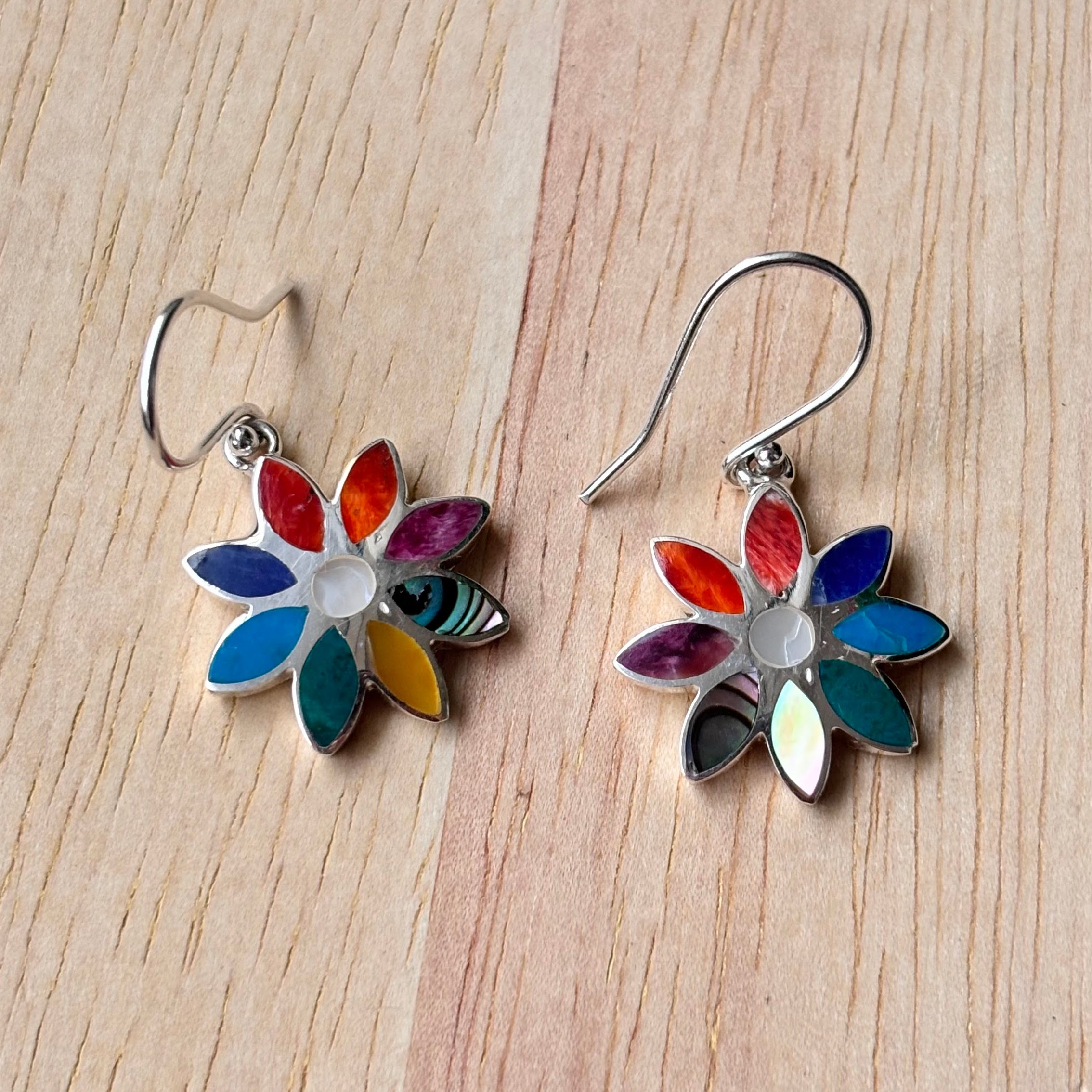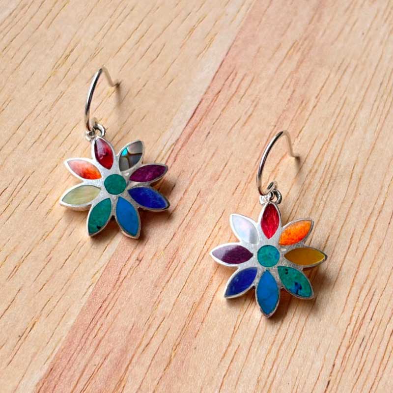 - Aretes de plata ley 950 con diseño de azucena peruana (Lirio de los incas), diseñado con incrustaciones de piedras naturales.